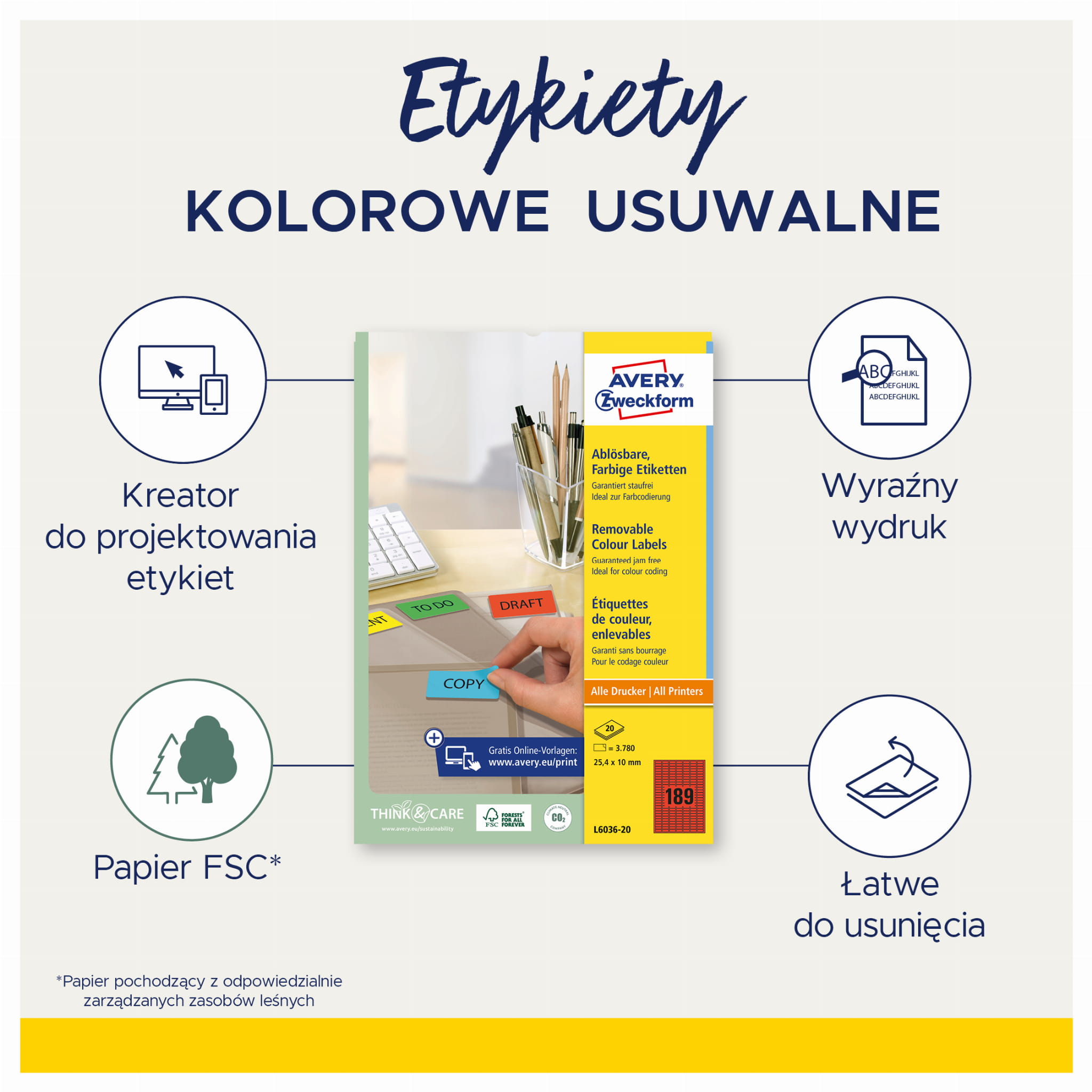 Etykiety te są również kompatybilne z różnymi rodzajami drukarek, takimi jak drukarki atramentowe, laserowe, laserowe kolorowe oraz kopiarki. Dodatkowo, korzystając z oprogramowania online Avery Design&Print oraz darmowych szablonów dostępnych na stronie internetowej avery-zweckform.pl/oprogramowanie, szybko i łatwo zaprojektujesz własne etykiety.
