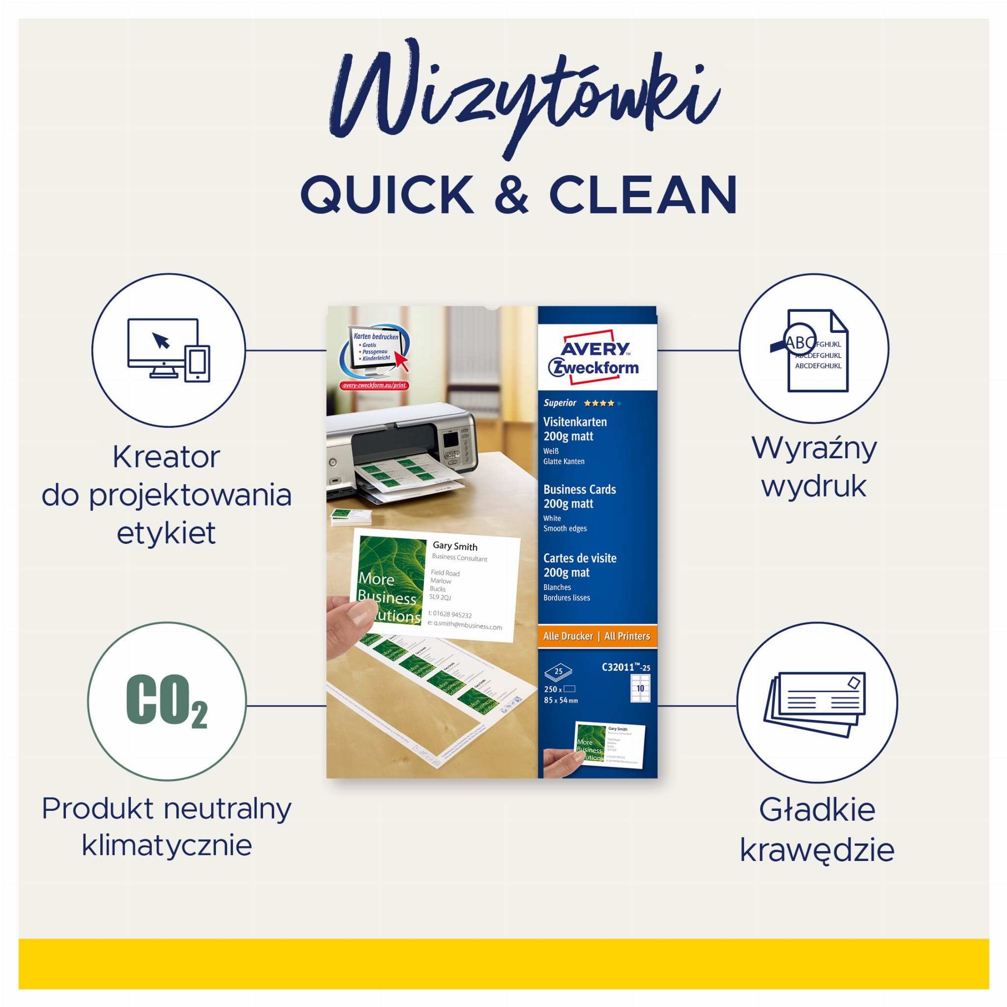 Wizytówki do druku Quick & Clean, 85 x 54 mm, 250 szt., 200 g, matowe, białe, Avery C32011-25