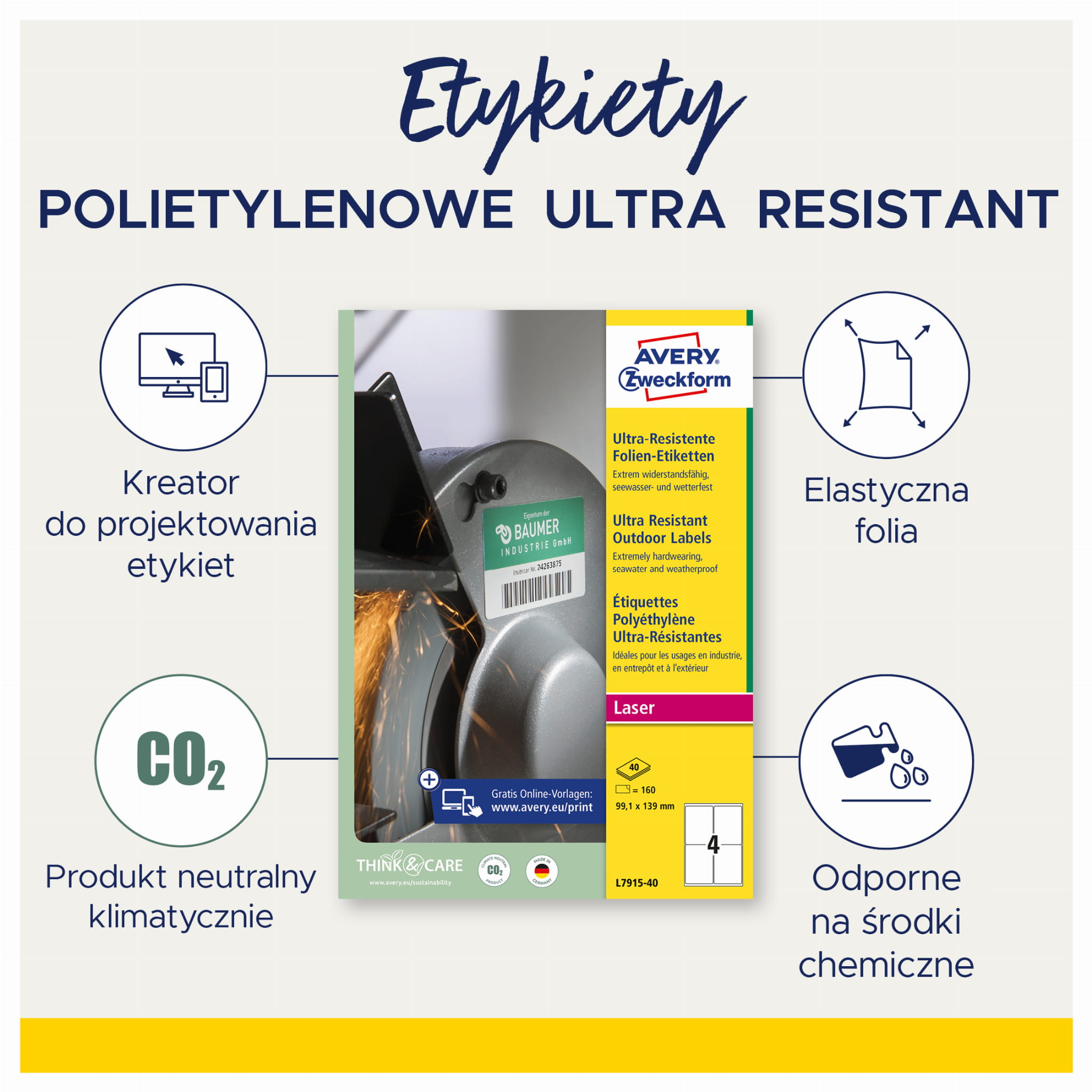 Etykiety polietylenowe Ultra Resistant są idealnym rozwiązaniem do trudnych i wymagających zastosowań. Ich mocny klej gwarantuje, że etykiety nie odkleją się od podłoża, nawet w trudnych i skomplikowanych warunkach. Największą zaletą tych etykiet jest ich niezwykła wytrzymałość, dzięki elastycznemu i rozciągliwemu materiałowi, dopasowują się one do każdego podłoża i pracują z nim.