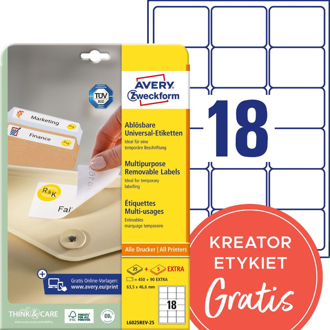 Usuwalne etykiety papierowe 63,5 x 46,6 mm, białe etykiety samoprzylepne, etykiety do druku 30 ark. / op., Avery L6025REV-25
