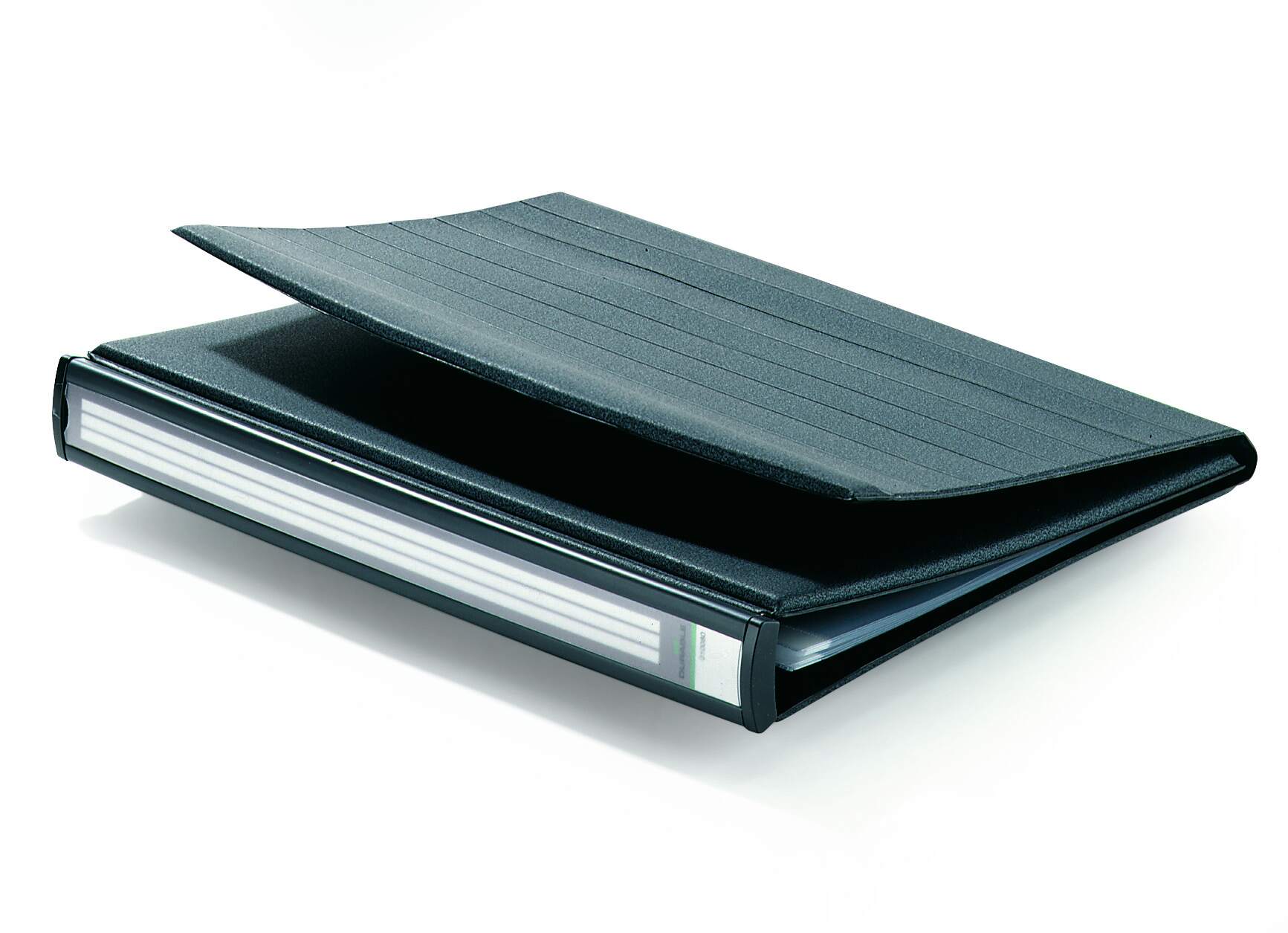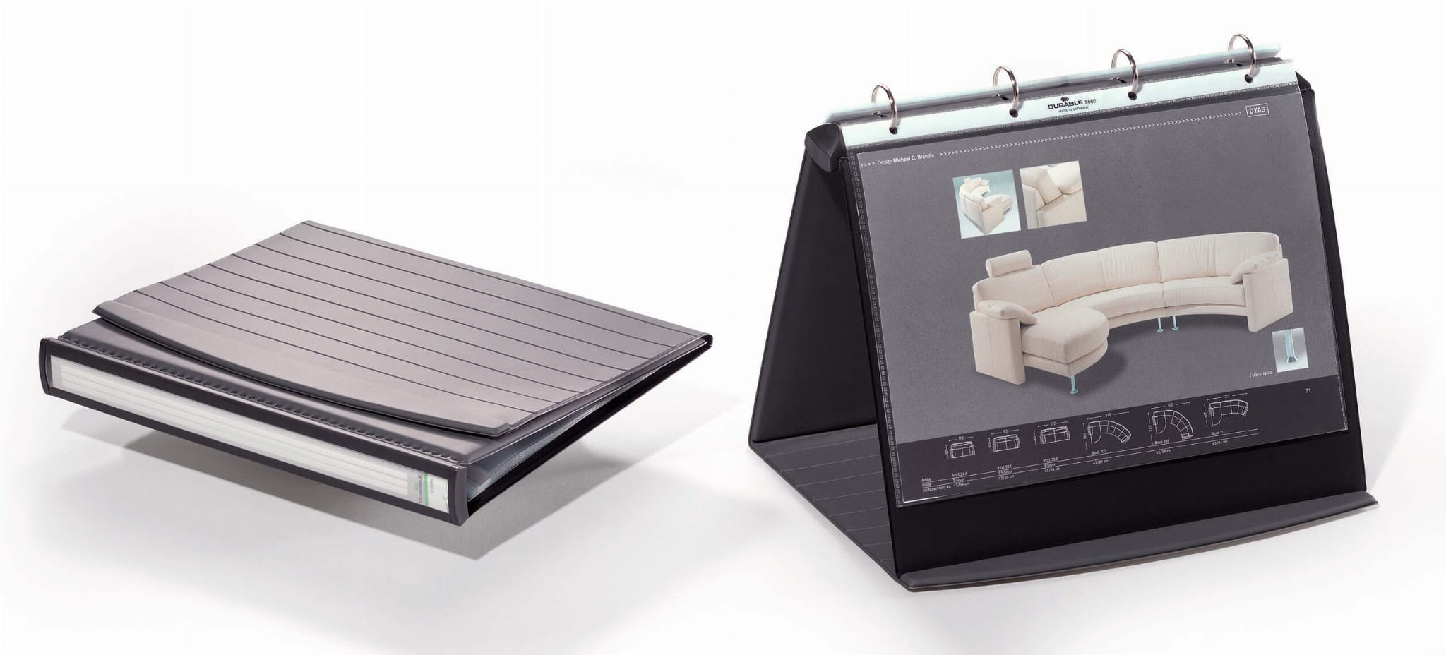 linie znajdujące się na przedniej stronie Flipcharta. • Flipchart stołowy ze stabilnym grzbietem i zamknięciem na rzep • Okładka ringowa do postawienia; do przechowywania w pionie (jak segregator) • Do opisania dzięki wyciąganemu paskowi opisowemu • Mechanizm czteroringowy włącznie z 10 foliami o niskim współczynniku odbicia światła odpornymi na rozdarcie wzdłuż brzegu z perforacją • Do dopełnienia o ok. 20 koszulek nr art. 8566 • Dla formatu A4 poziomo