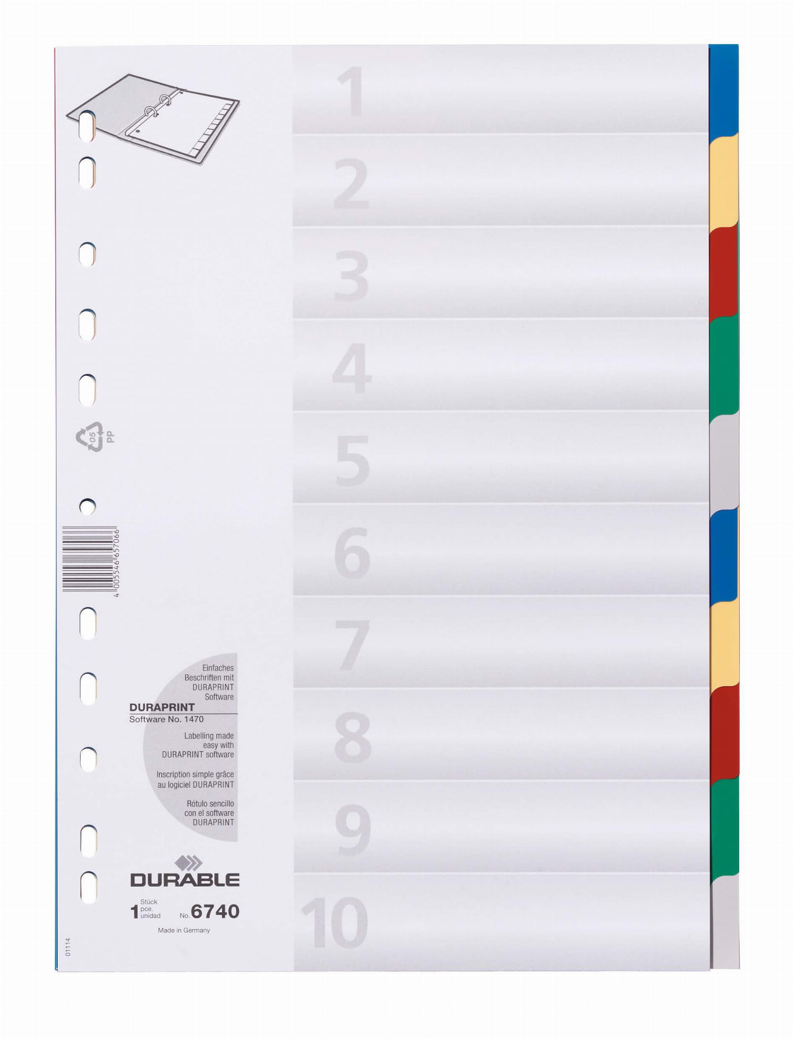 Durable Przekładki A4 10 części, kolorowe indeksy i przednia okładka PP
