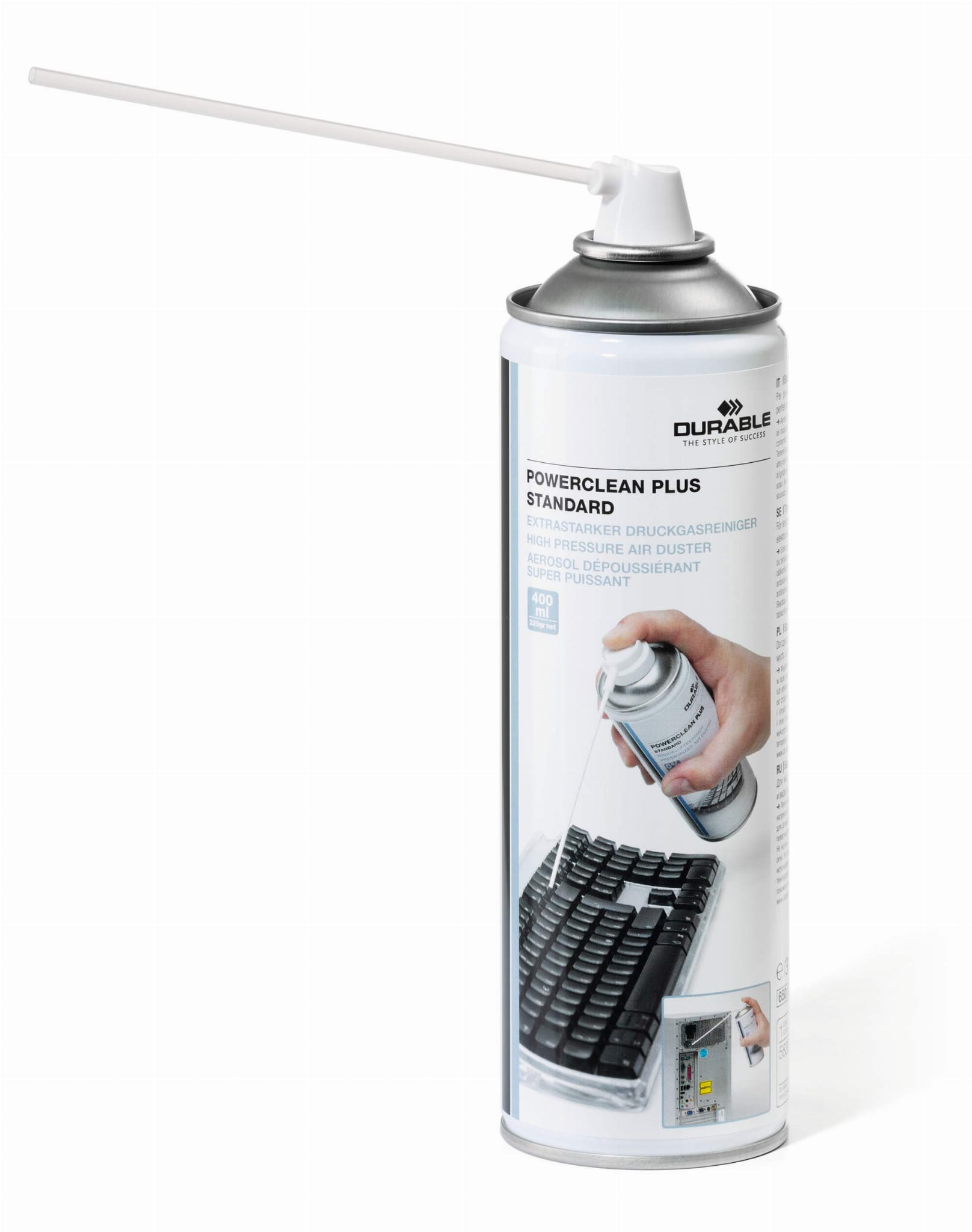 • Wyjątkowo skuteczny środek do czyszczenia ze sprężonym powietrzem w puszce z praktyczną dyszą do trudno dostępnych miejsc • Produkt idealny do biurowych urządzeń elektronicznych oraz aparatów fotograficznych itd. • Najskuteczniejsze działanie w przypadku krótkich serii i odległości ok. 20 cm od czyszczonego przedmiotu • Palny • : 400 ml