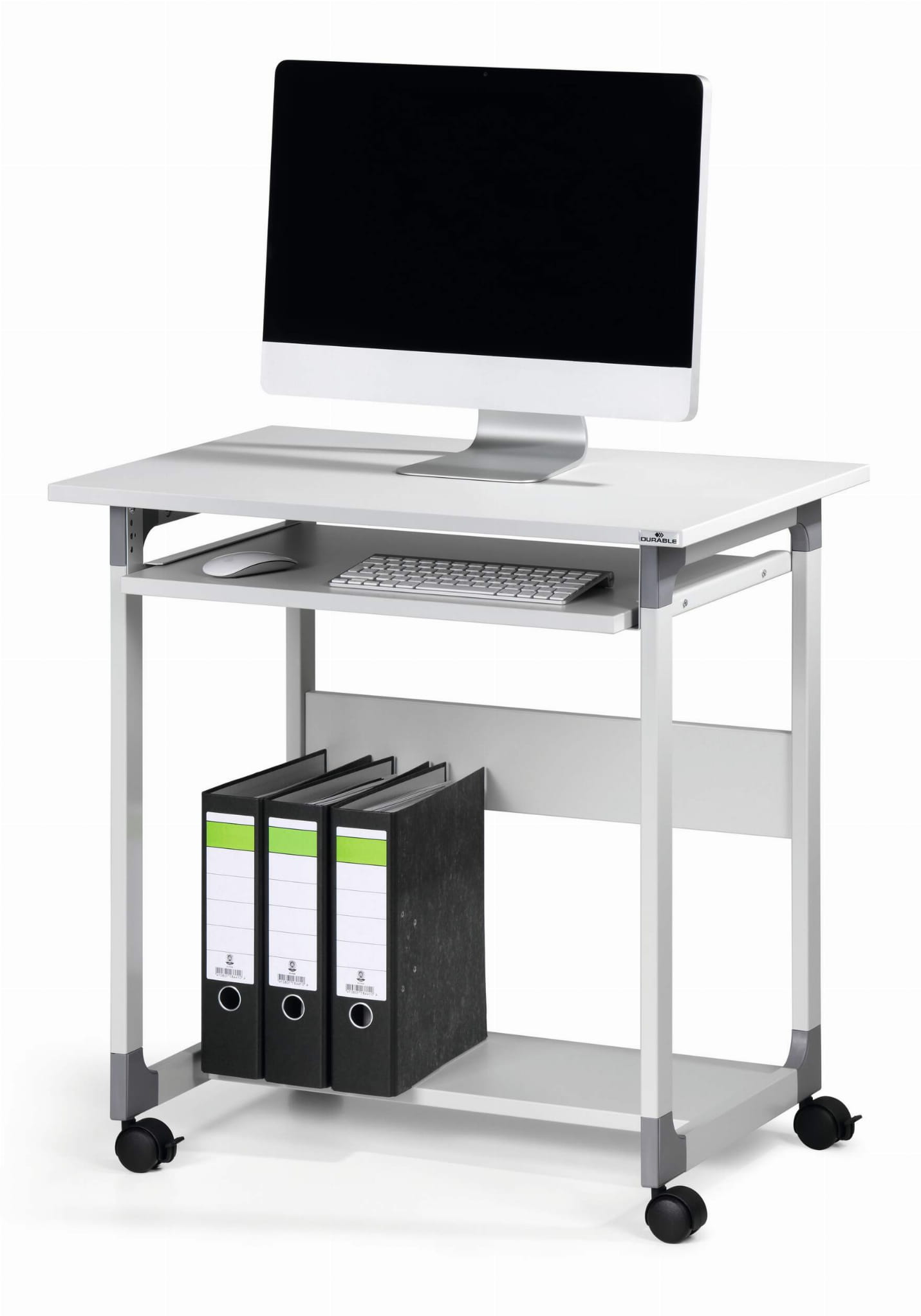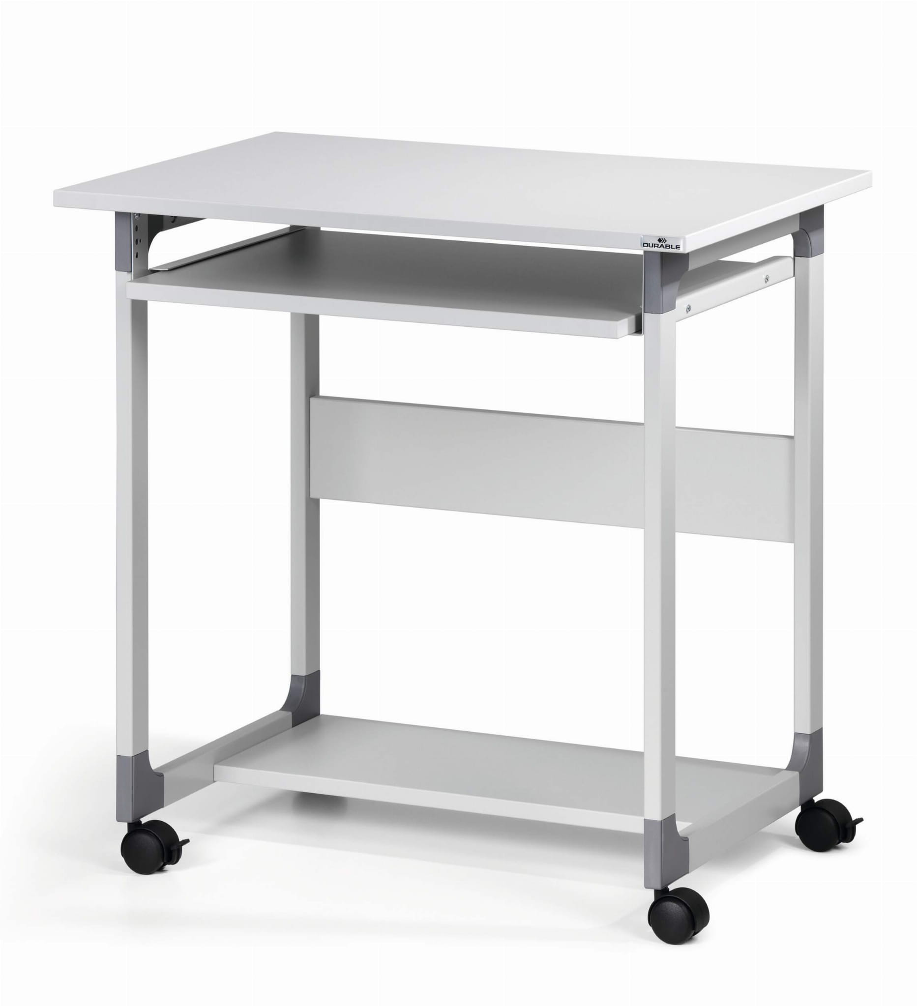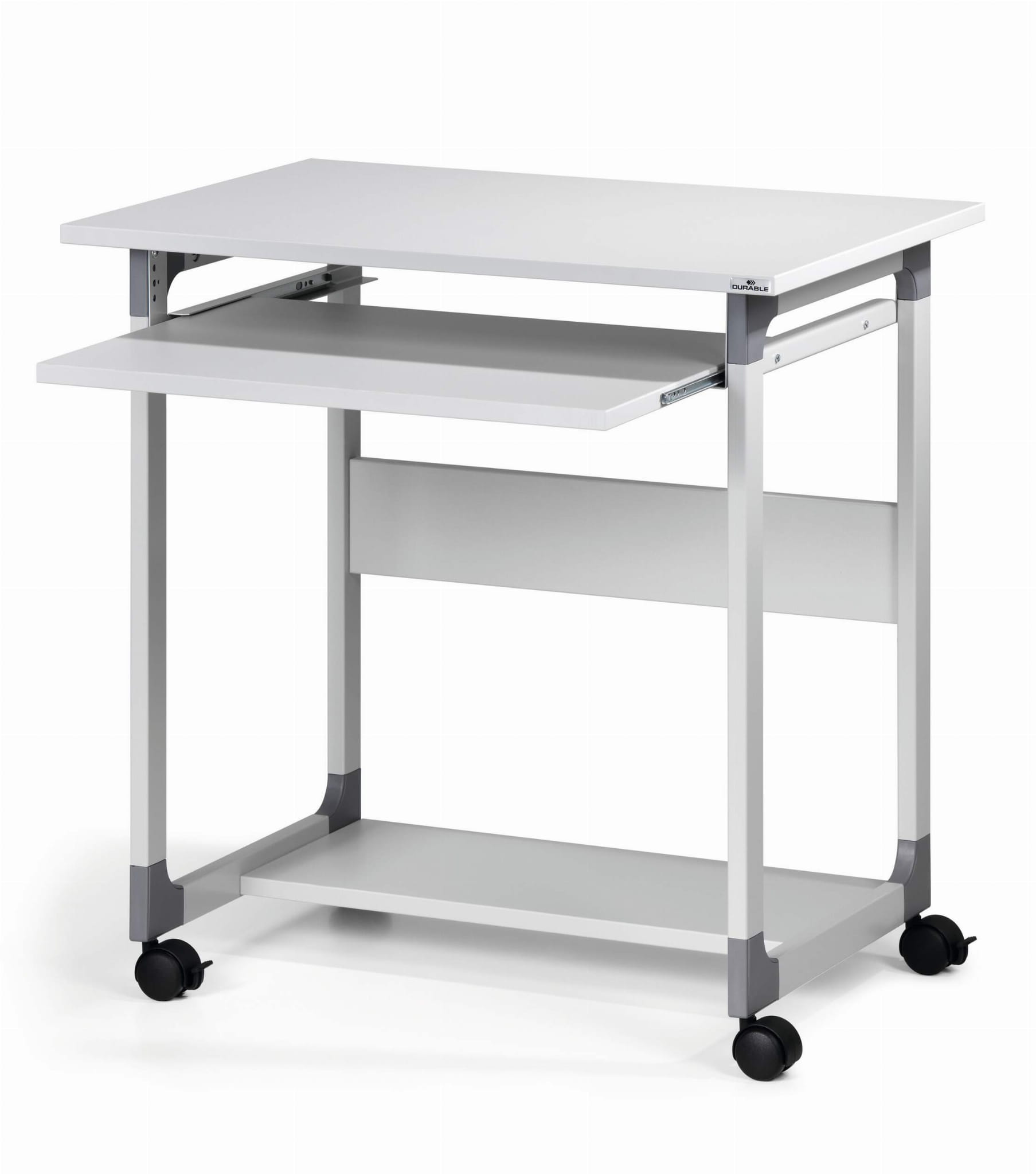 Stolik do komputera z 2 półkami i jedną wysuwaną półką pod klawiaturę. Możliwość regulacji wysokości tej półki pomiędzy 550 a 630 mm. • Wszechstronny stolik z wysuwaną półką pod klawiaturę • Wielostronne zastosowanie dzięki regulowanej wysokości od 550 do 630 mm • Mobilna i stabilna w ruchu (4 rolki, w tym 2 z hamulcem) • Dwie wytrzymałe półki (grubość 19 mm) idealne pod monitor, drukarkę, segregatory itp. • Prosty montaż za pomocą załączonej instrukcji montażowej • Stabilna rama z odpornej na zadrapania stali i rogami z tworzywa sztucznego wzmocnionymi włóknem szklanym