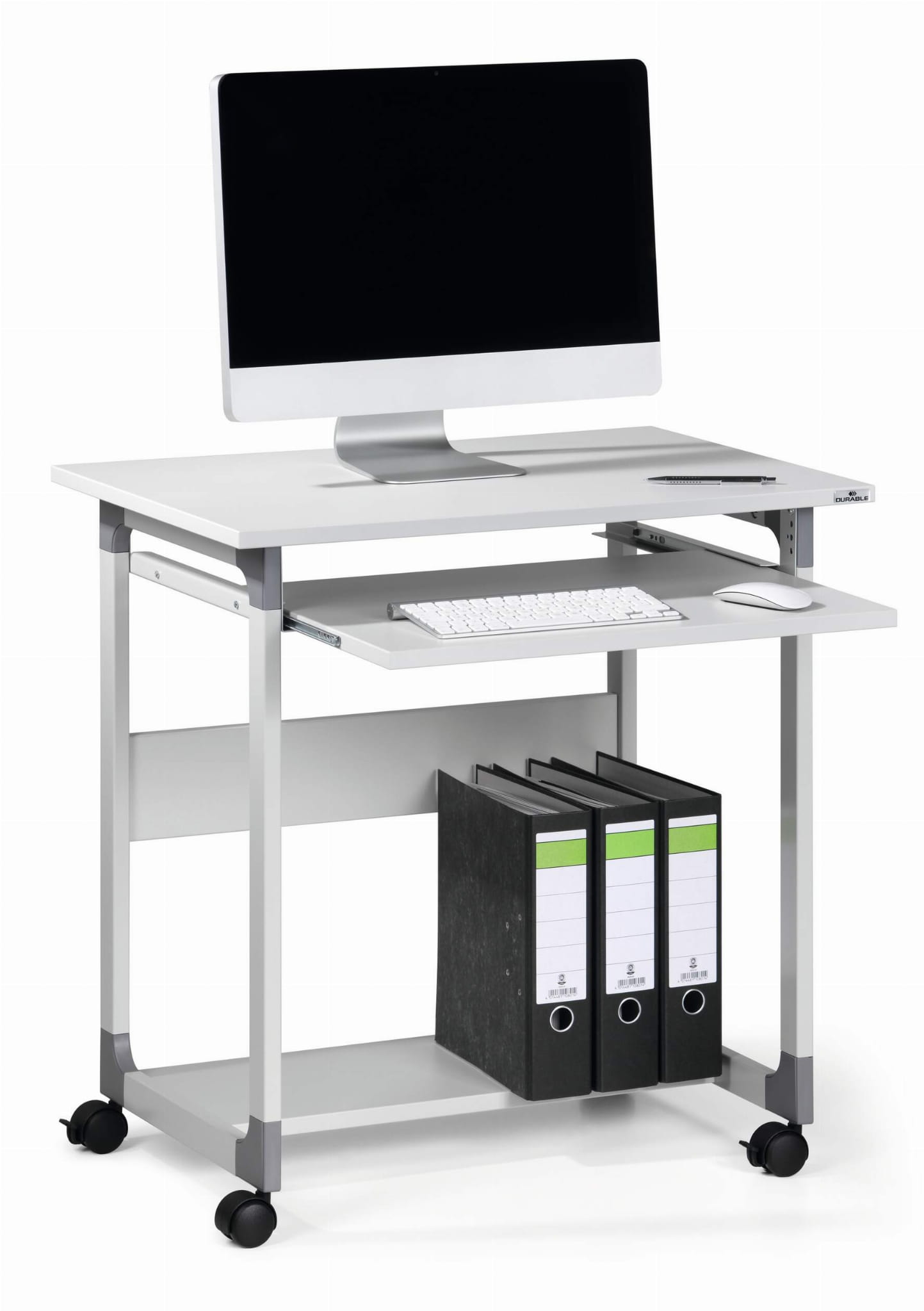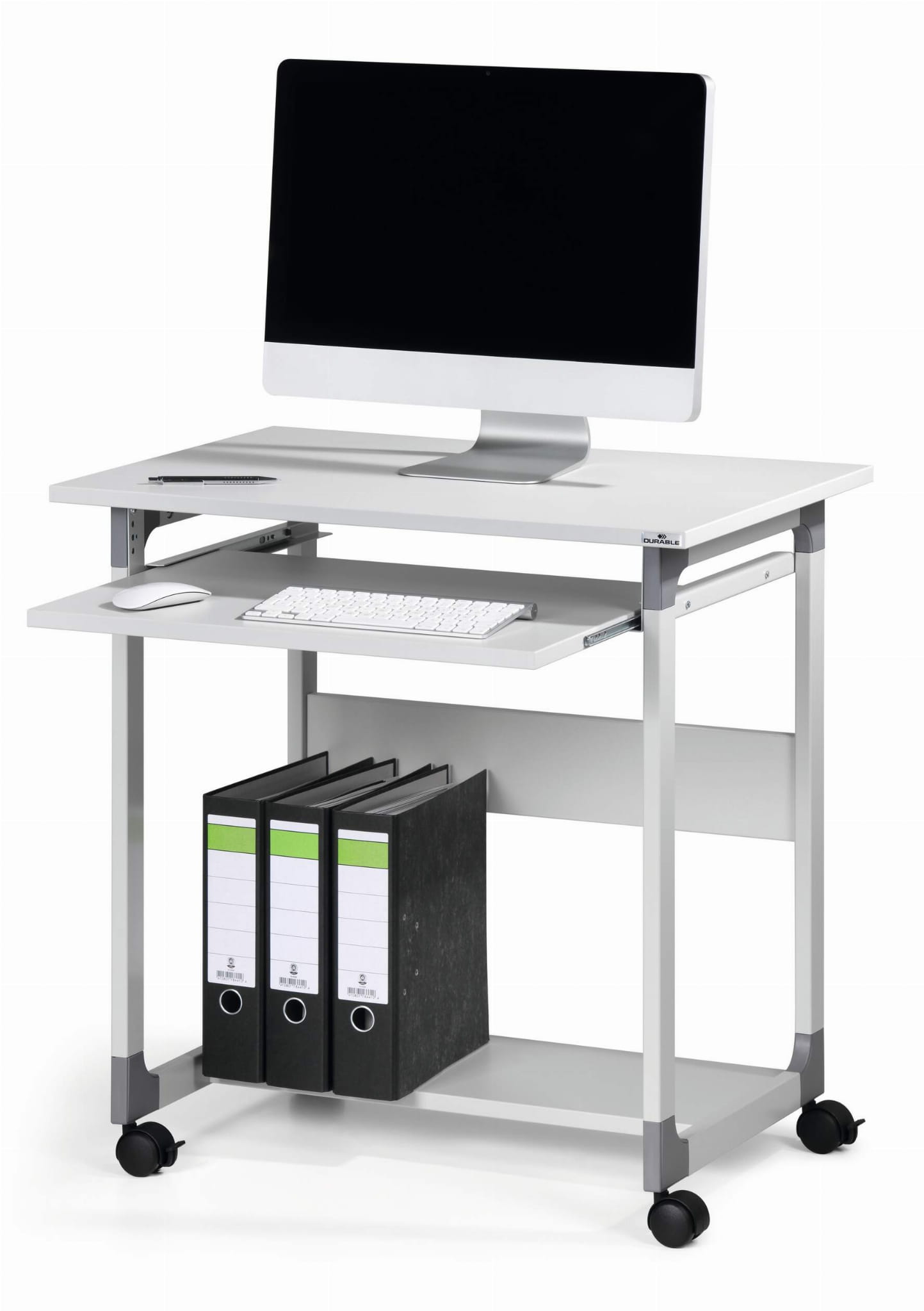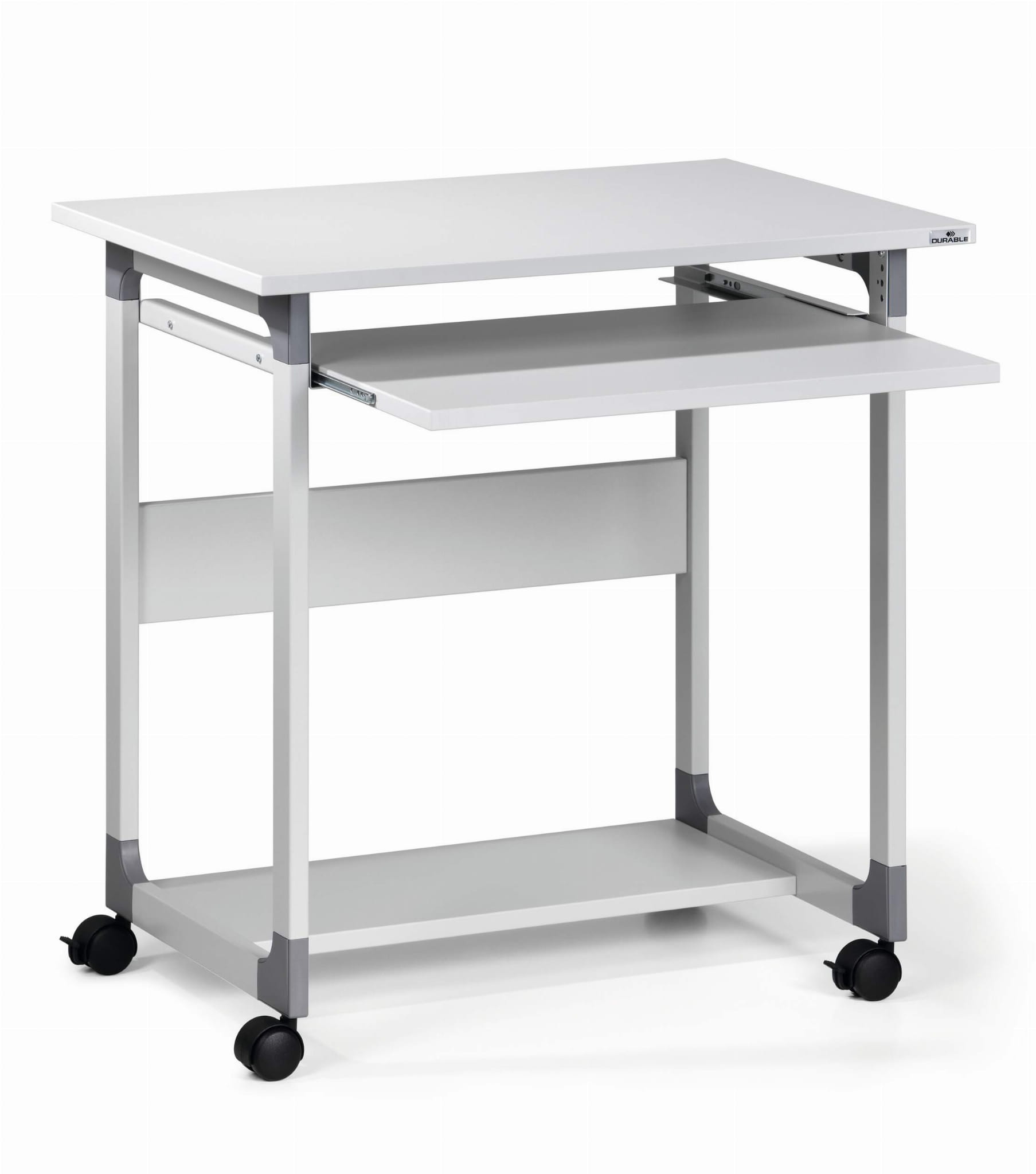 Stolik do komputera z 2 półkami i jedną wysuwaną półką pod klawiaturę. Możliwość regulacji wysokości tej półki pomiędzy 550 a 630 mm. • Wszechstronny stolik z wysuwaną półką pod klawiaturę • Wielostronne zastosowanie dzięki regulowanej wysokości od 550 do 630 mm • Mobilna i stabilna w ruchu (4 rolki, w tym 2 z hamulcem) • Dwie wytrzymałe półki (grubość 19 mm) idealne pod monitor, drukarkę, segregatory itp. • Prosty montaż za pomocą załączonej instrukcji montażowej • Stabilna rama z odpornej na zadrapania stali i rogami z tworzywa sztucznego wzmocnionymi włóknem szklanym