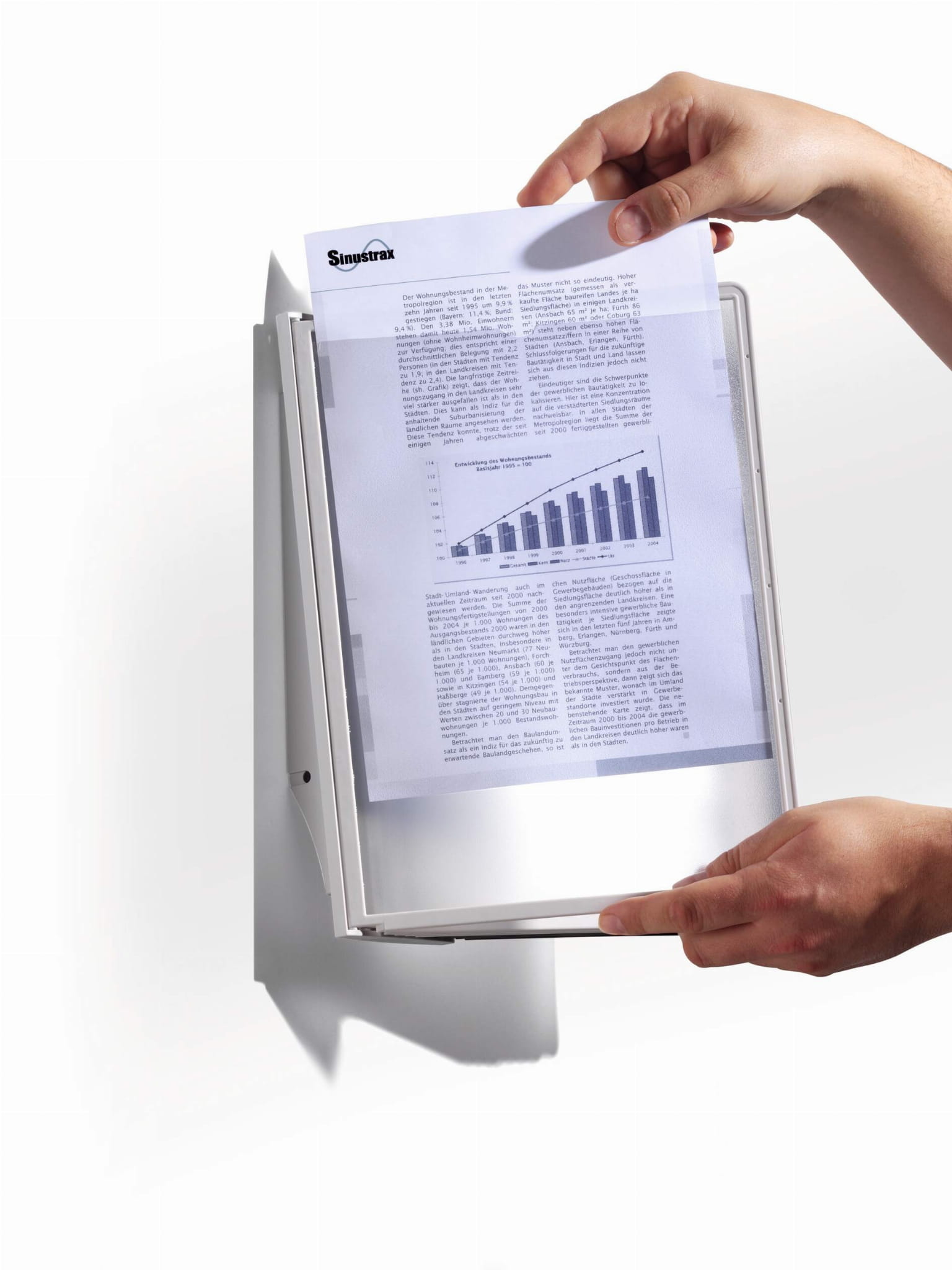 A4 (Art. Nr.: 5606) i 10 indeksów z pustymi wkładami. • Obszerny naścienny zestaw prezentacyjny • Uchwyt naścienny z 10 panelami prezentacyjnymi SHERPA® w formacie A4 (kolor -00: po 5 sztuk w kolorze czerwonym i czarnym, kolor -22: wersja szara i czarna) • Panele prezentacyjne wykonane z polipropylenu, z kolorową ramką i folią nadającą się do skanerów dzięki niewielkiemu współczynnikowi odbicia światła • Produkt jest wyposażony w zakładki indeksujące z pustymi wkładami do opisu paneli • Praktyczny mechanizm sworzniowy zapewnia łatwą wymianę paneli • 5 lat gwarancji • Łatwy montaż uchwytu do wpinania paneli prezentacyjnych