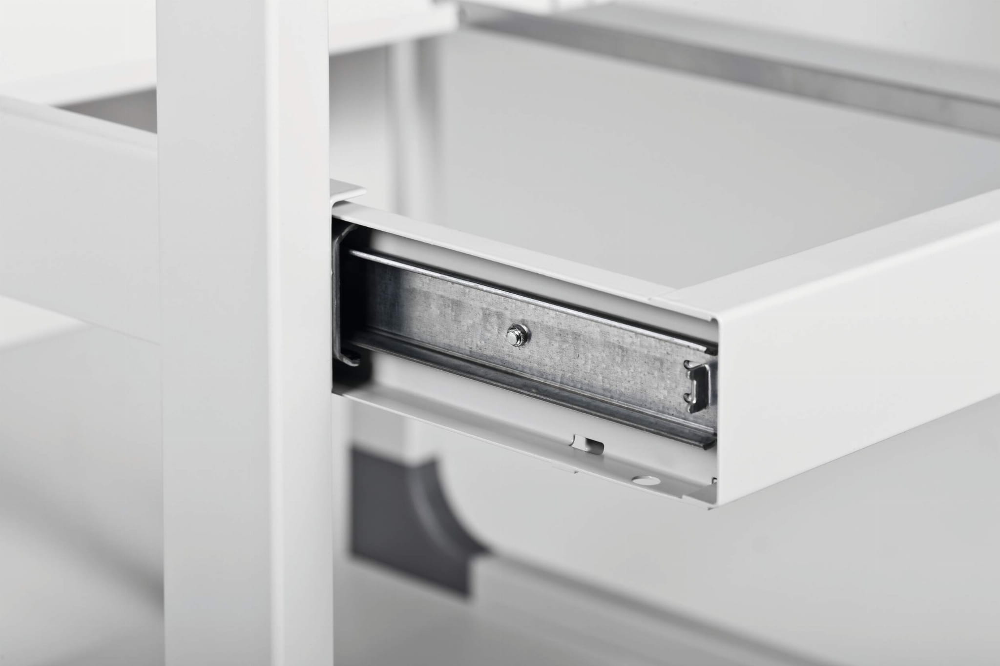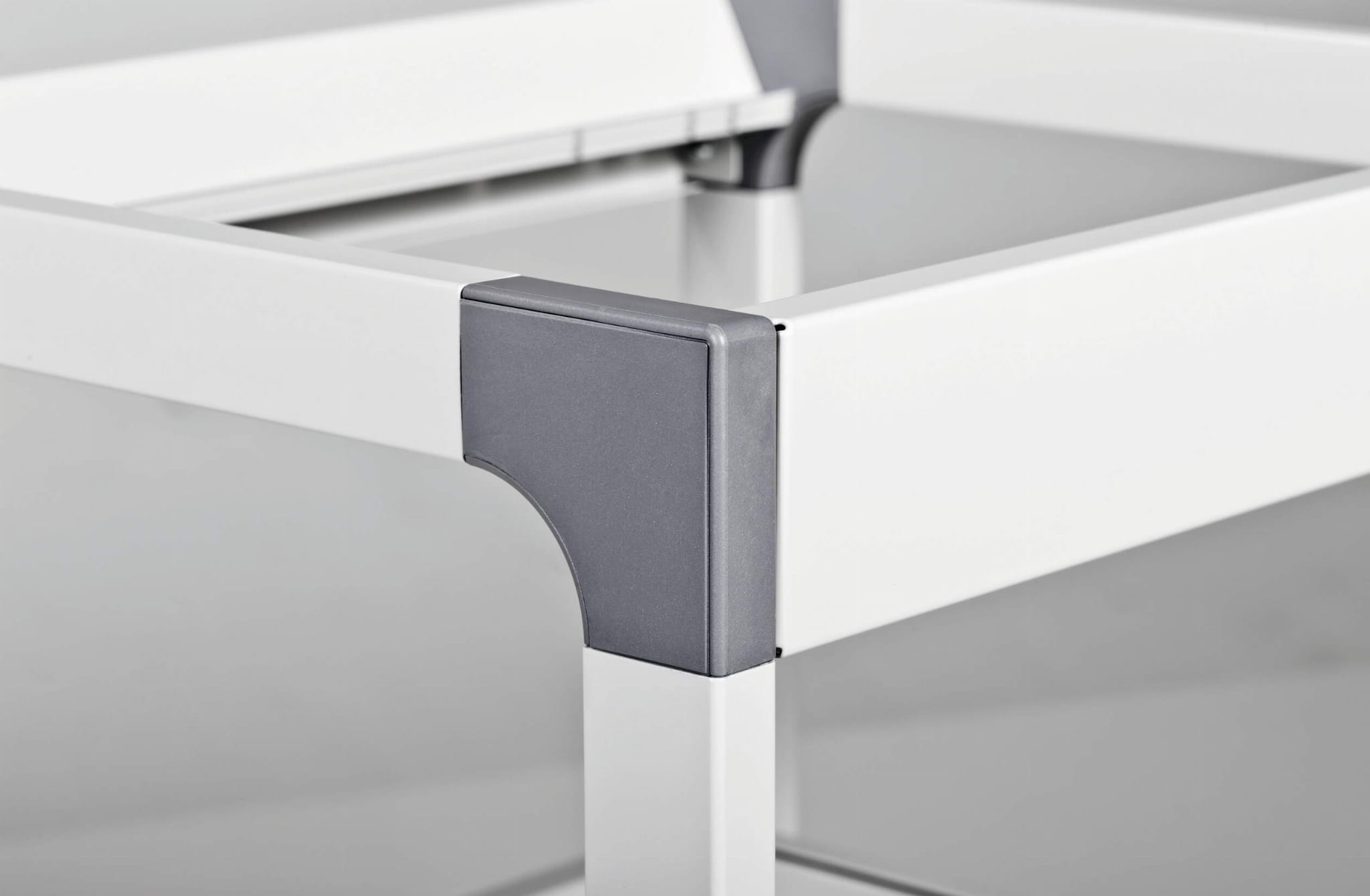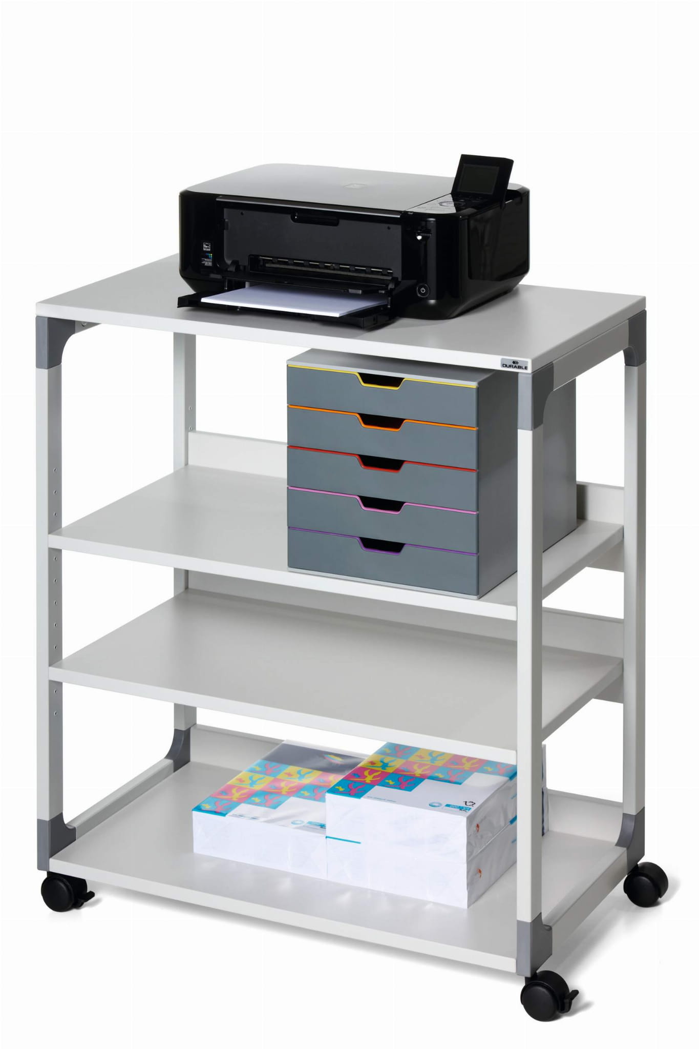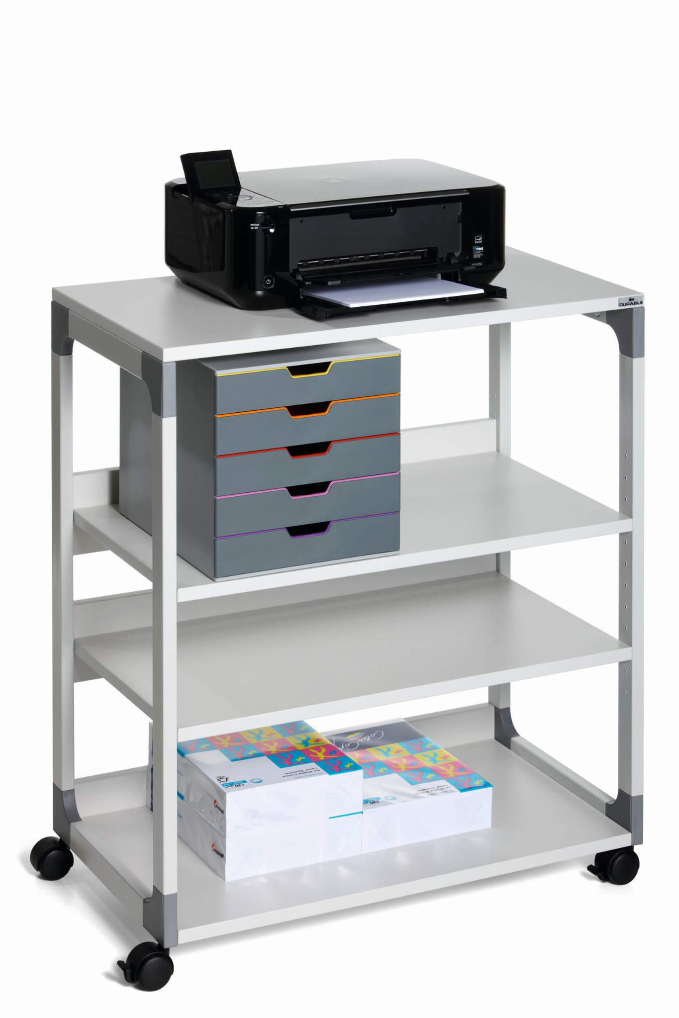 Wielofunkcyjny stolik biurowy na kółkach z czterema półkami. Wykonany ze stali pokrytej żywicą epoksydową. Z narożnikami z tworzywa sztucznego wzmocnionego włóknem szklanym oraz pokrytymi melaniną półkami o grubości 19 mm. • Wielofunkcyjna szafka na rolkach do przechowywania urządzeń elektrycznych i przyborów biurowych • Mobilna i stabilna w ruchu (4 rolki, w tym 2 z hamulcem) • Cztery wytrzymałe półki (grubość 19 mm) w tym dwie o regulowanej wysokości (w odstępach 32 mm) umożliwiają przechowywanie różnych przedmiotów • Bezpieczne przechowywanie segregatorów czy papieru dzięki poprzecznemu zabezpieczeniu przed wypadnięciem przedmiotów • Prosty montaż za pomocą załączonej instrukcji montażowej • Stabilna rama z odpornej na zadrapania stali i rogami z tworzywa sztucznego wzmocnionymi włóknem szklanym
