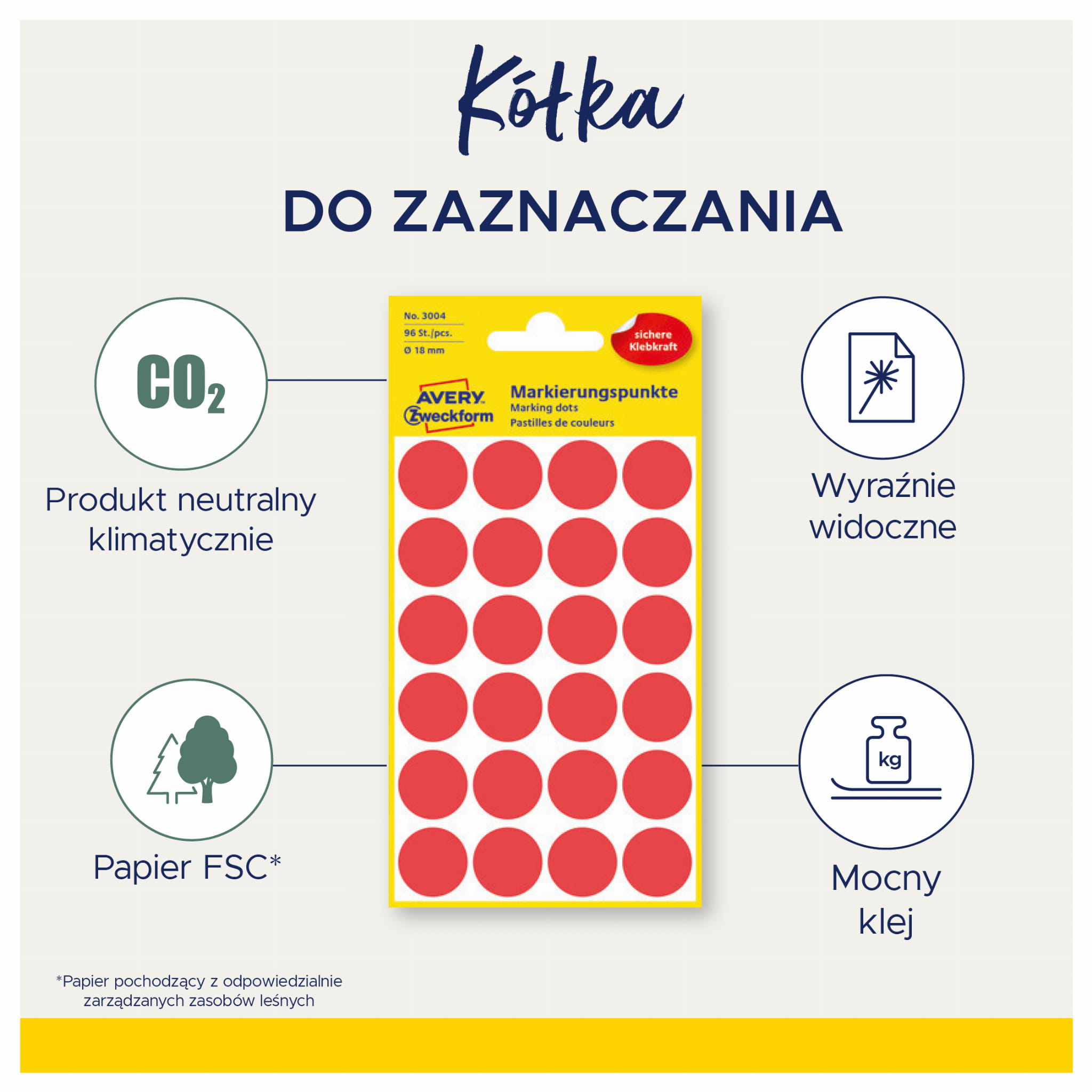 Kółka do zaznaczania Ø 12 mm, czerwone etykiety papierowe, etykiety okrągłe z trwałym klejem, etykiety do oznaczenia 270 etyk. / op., Avery 3141