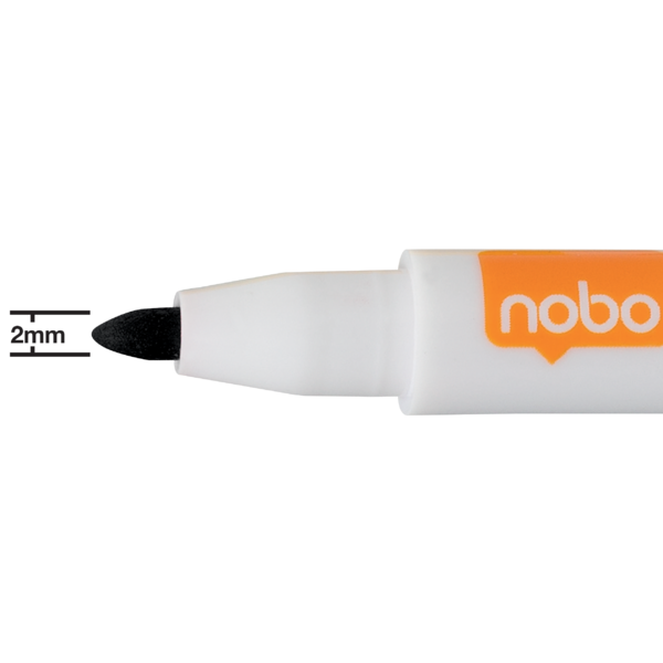Markery suchościeralne NOBO Mini z gąbką i magnesem dostępne w 6 wyrazistych kolorach (czerwony, żółty, zielony, niebieski, fioletowy, czarny). Tusz niskozapachowy i nietoksyczny.