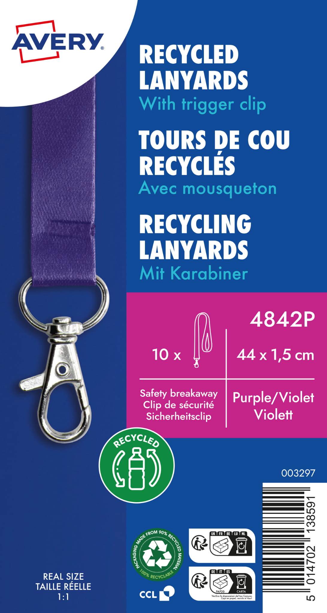 Smycz na identyfikator z recyklingowanego PET, 10 szt.; 15 x 440 mm; fioletowe smycze, AVERY 4842P