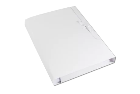 Wykonana z kartonu celulozowego (300g, format A4, wymiary: 320 x 250 x 50 mm), spełniającego rygorystyczną normę ISO 9706 (pH >7,5, rezerwa alkaliczna >0,4 mol/kg, liczba Kappa <5). 100% celuloza gwarantuje trwałość i odporność na starzenie.