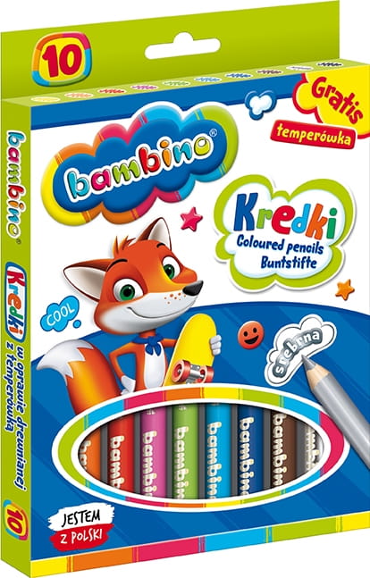Produkowane w Polsce, kredki Bambino spełniają normy dyrektywy Parlamentu Europejskiego i Rady w sprawie bezpieczeństwa zabawek oraz rozporządzenia Ministerstwa Gospodarki w sprawie zasadniczych wymagań dla zabawek, co daje gwarancję bezpieczeństwa i najwyższej jakości produktu. W zestawie znajduje się również temperówka do utrzymania odpowiedniego ostrza kredek. Zachęcamy do twórczych eksperymentów z kolorami z kredkami Bambino!