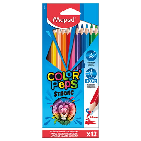 Kredki Color'Peps STRONG to idealny wybór dla małych artystów. Wykonane z żywicy syntetycznej, korpus kredki jest elastyczny i giętki, co sprawia, że jest wygodny w trzymaniu. Trójkątny kształt pozwala na poprawne trzymanie i nie męczy małych dłoni. Grafit o przekroju 3,2mm został wzmocniony, dzięki czemu jest niezwykle odporny na kruszenie i łamanie. W porównaniu do standardowych kredek Color'Peps grafit jest o 37% bardziej wytrzymały. Kredek jest łatwy do temperowania - nie strzepią się i nie zostawiają drzazg na rysunku. Wszystkie kredki są produkowane zgodnie z najwyższymi standardami jakości i zgodnie z regulacjami dotyczącymi produktów dla dzieci. Pakowane w praktyczne, kartonowe etui, zestaw zawiera 12 sztuk kredki, które sprawią, że każde dziecko będzie miało kolorowy i twórczy czas zabawy.