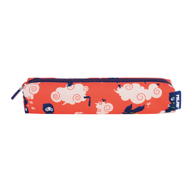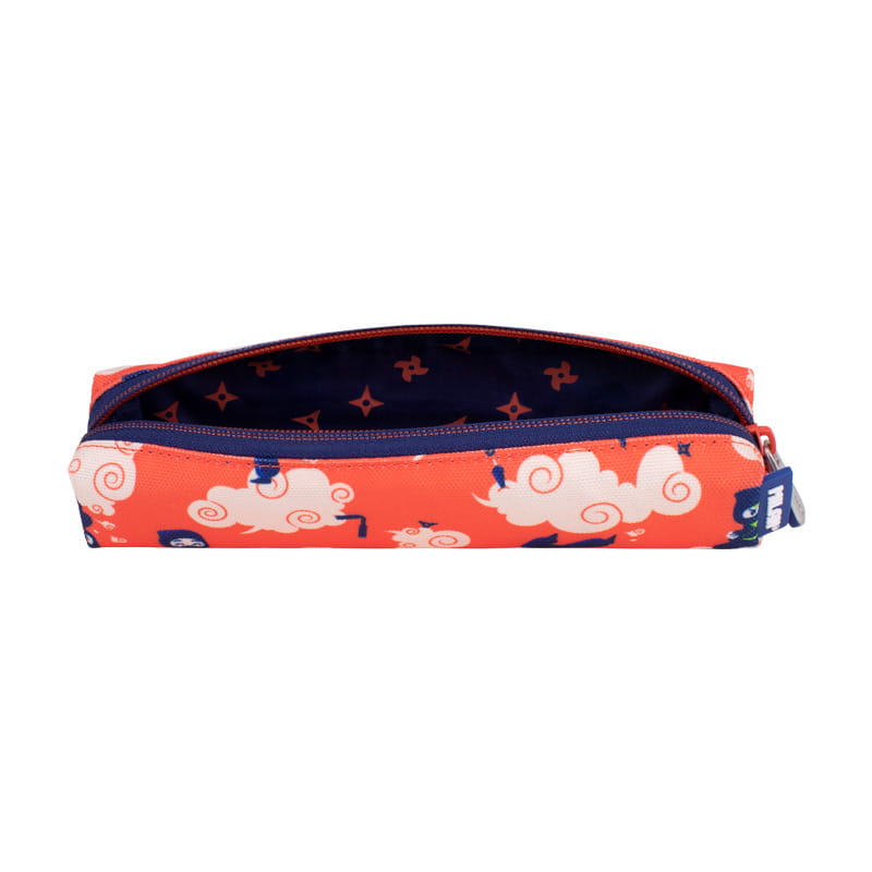 Piórnik mini kwadratowy z kolekcji NINJUTSU, czerwony. Zapinany na suwak. Kolekcja NINJUTSU pokazuje cichych i zabawnych ninja skaczących przez chmury. Wzór nadrukowany na czerwonym tle z kremowymi chmurkami i granatowymi detalami. Rozmiar: 20,5 x 4,5 x 5 cm. Materiał wierzchni i podszewka 100% poliester.